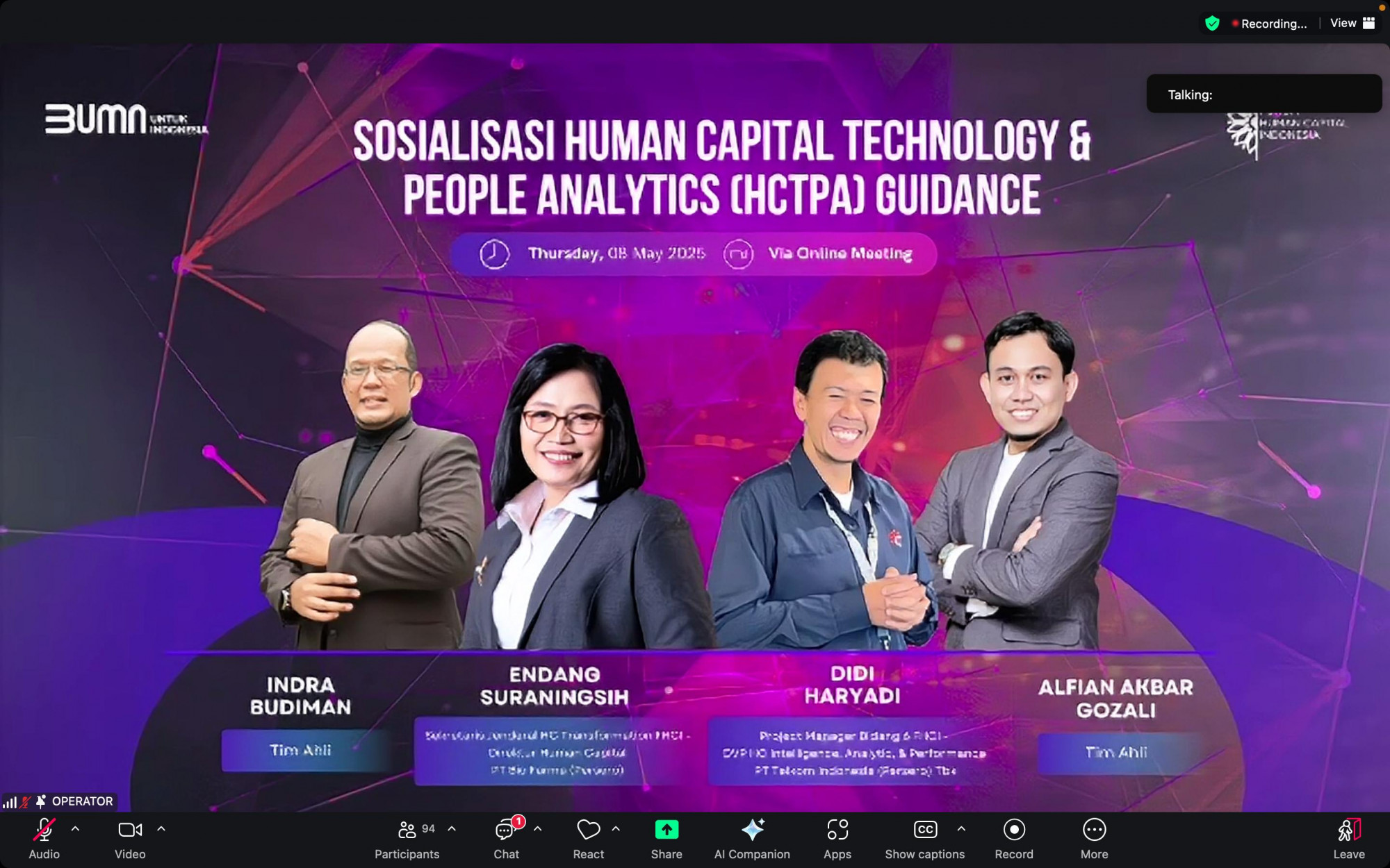 Sekretaris Jenderal HC Transformation Forum Human Capital Indonesia (FHCI) Endang Suraningsih mengatakan program Human Capital Technology & People Analytics (HCTPA) merupakan salah satu pendorong utama transformasi digital di sektor sumber daya manusia (SDM) atau human capital (HC) BUMN pada Kamis (08/05).